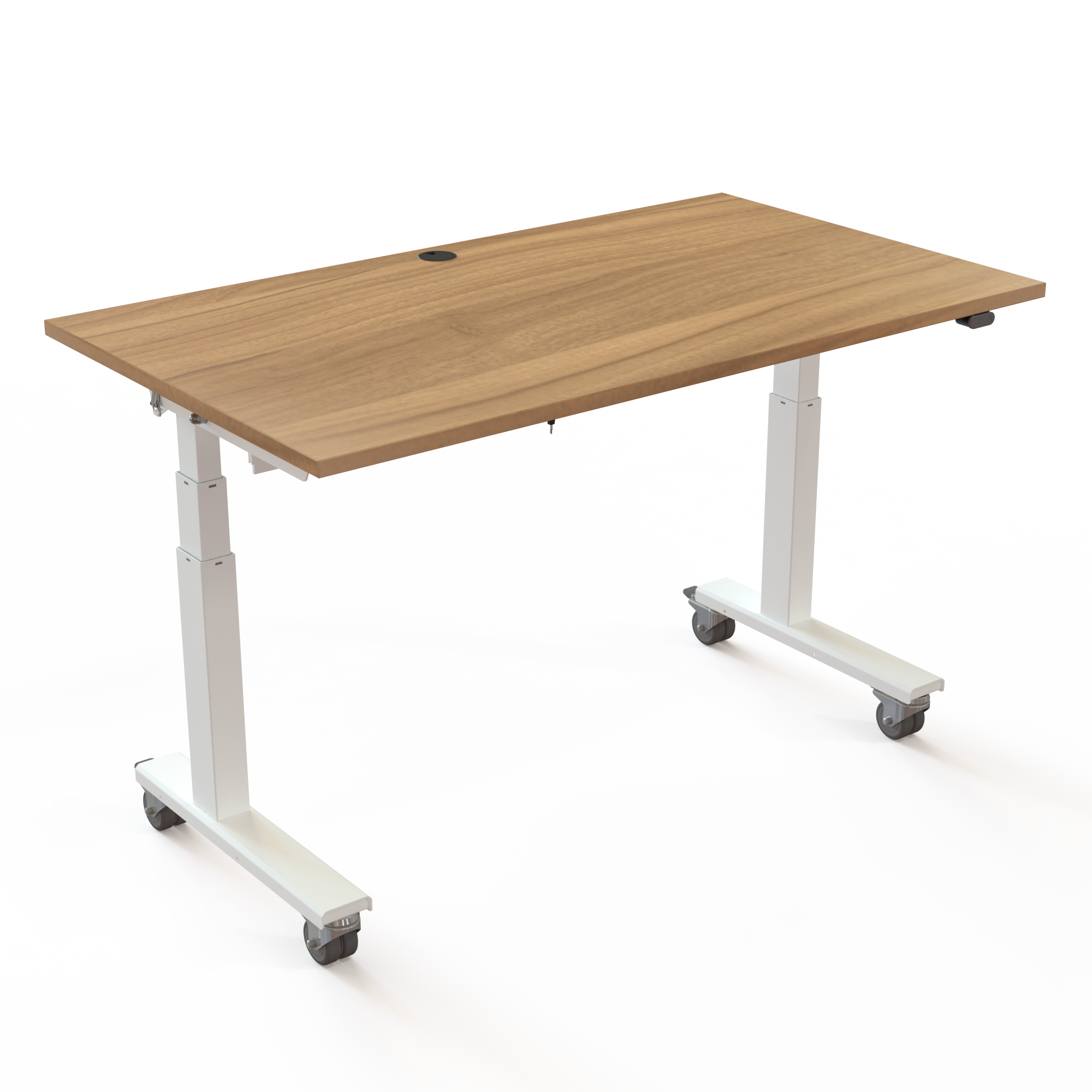 Adjustment between 67-132 cm and 40 kg capacity ensures comfort. Sturdy powder-coated RAL 9016 (white) steel frame with durable beech melamine top. Short assembly time is practical for large nesting fleets. Excels as an efficient solution for hot desking environments.